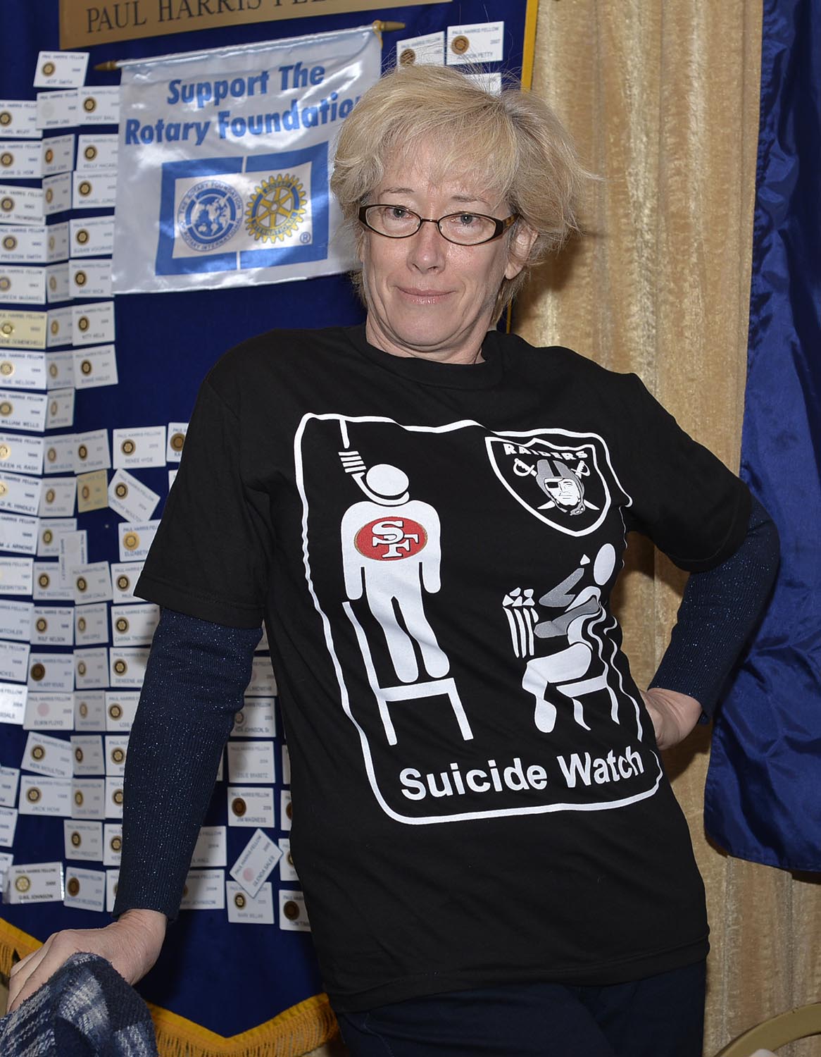 In the spirit of good-rivalry fun, Tom presented Leslie Lewis with a t-shirt which down-plays her team (49ers) and highlights his (Raiders). This could be a warring good time at the Castle! Leslie offered up a Give-Back green slip towards her fines.