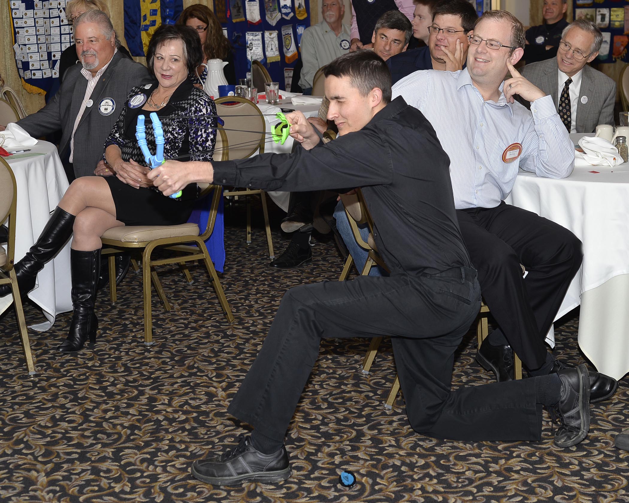 Bill Bolster had the lucky number to play the Slingshot Raffle Game. Bill wisely looked for youth in the room to improve his odds with the slingshot. He offered the challenge to our dining room server, Zach, who, if successful,