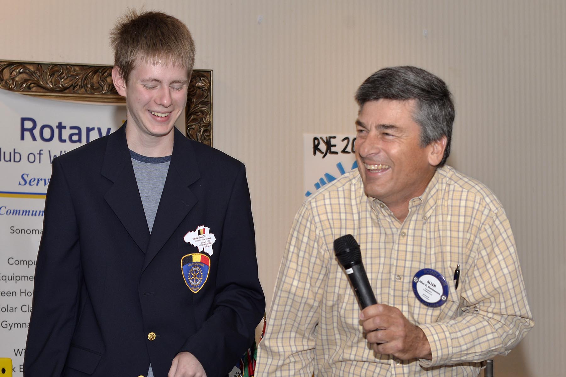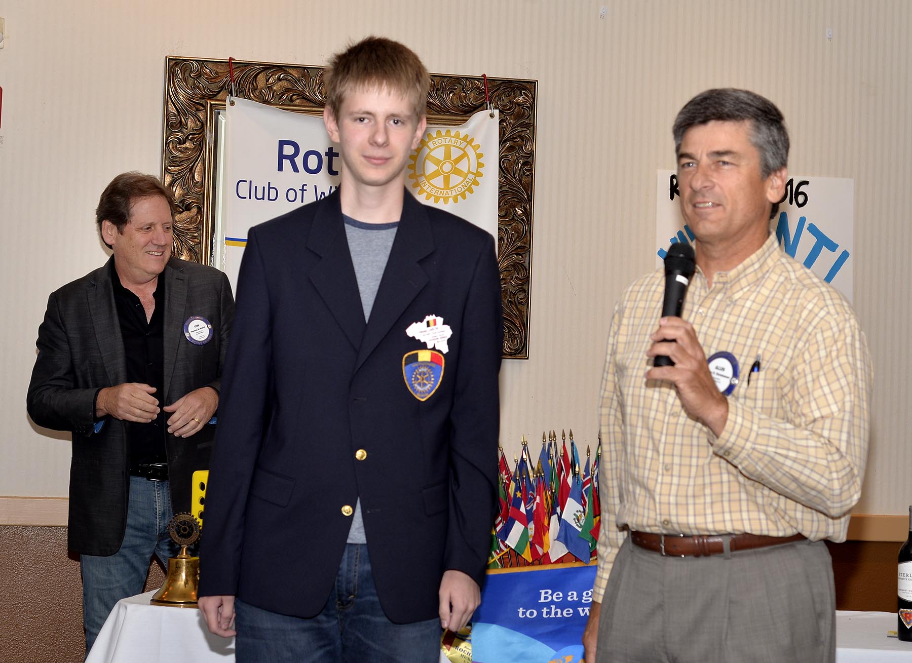 Vincent Larcin, our newly arrived Youth Exchange Student from Belguim, was formally introduced by host patent Allen Christenson . Allen introduced him to American life by handing him a power saw and allowing him to cut down trees Saturday at the home of Rags. Liability issues not withstanding, Allen has the opportunity to be a fine host parent. Acting President Tom then exchanged Rotary Flags with our newest Exchange Student, Vincent