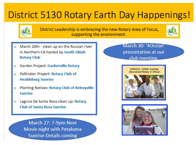 Barbara McChesney reminded us that Rotary’s seventh area of focus is on the environment. She and Heather Cullen are working on a project for our club to become a part of the ESRAG (Environmental Sustainability Rotarian Action Group). She let us know that our efforts these days are focused on the Vaccination project, but there are other clubs that are doing a lot of cleanup of waterways and many other clubs will appreciate your volunteering to lend them a hand. Get outside and appreciate the effort to clean Sonoma County waterways. Heather said getting a little dirty to make things clean is healthy for everyone, especially those with dirty hands.