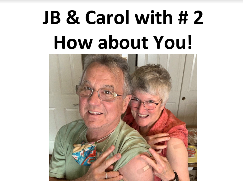 If you have been vaccinated let Pres Bill know because we are now allowed to gather in small groups as long as everyone has been fully vaccinated. The scribe is getting his second dose of Moderna this weekend.
