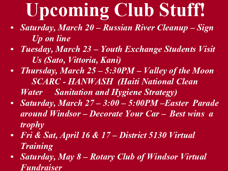 Pres Bill shared that Sonoma County has a program to adopt a road, which we should consider because we can get a sign posted promoting the Rotary Club of Windsor for keeping it clean.